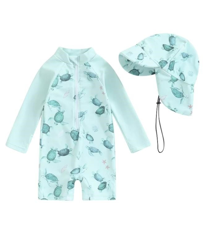 Güneş Korumaşlı Uzun Kollu Erkek Bebek Şapka Mayo Set